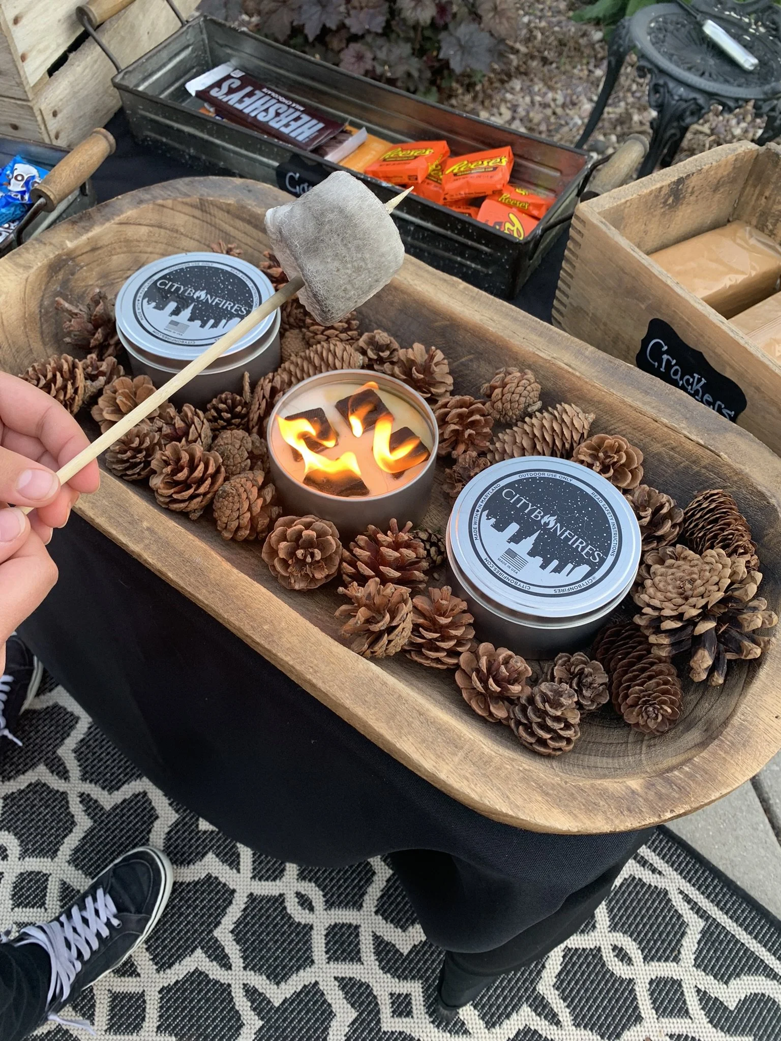 Hershey chocolate, graham crackers, marshmallows, skewers, and a city bonfire (portable, reusable mini bonfire, a 4-inch by 2-inch round metal tin that is filled with non-toxic soy wax).