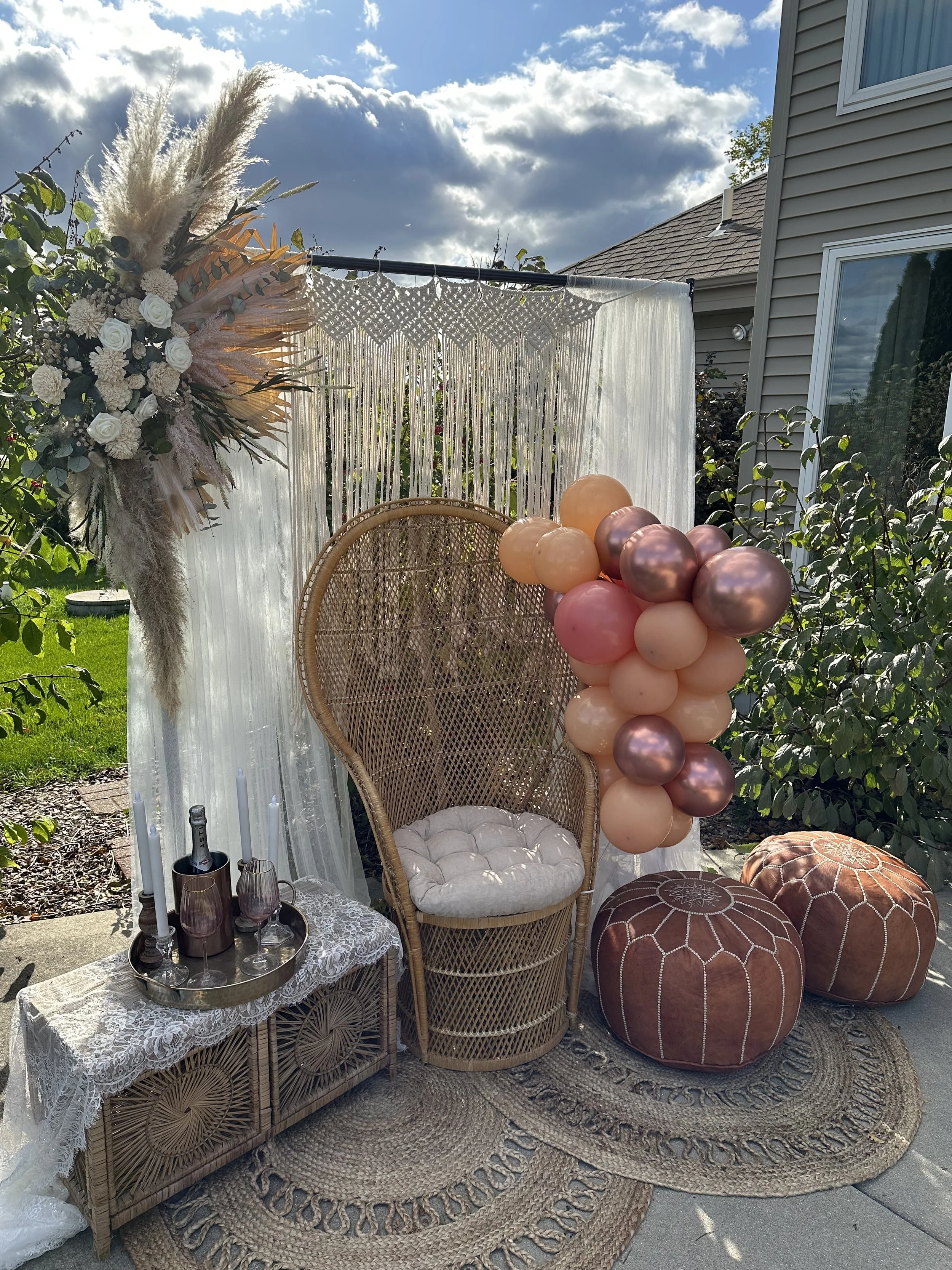 Peacock chair with balloons or pompass grass, curtains with macrame fringe, dry flower arrangement (fresh floral arrangement is an option),rugs, leather pouf and wicker chest. Perfect for bridal or baby showers!