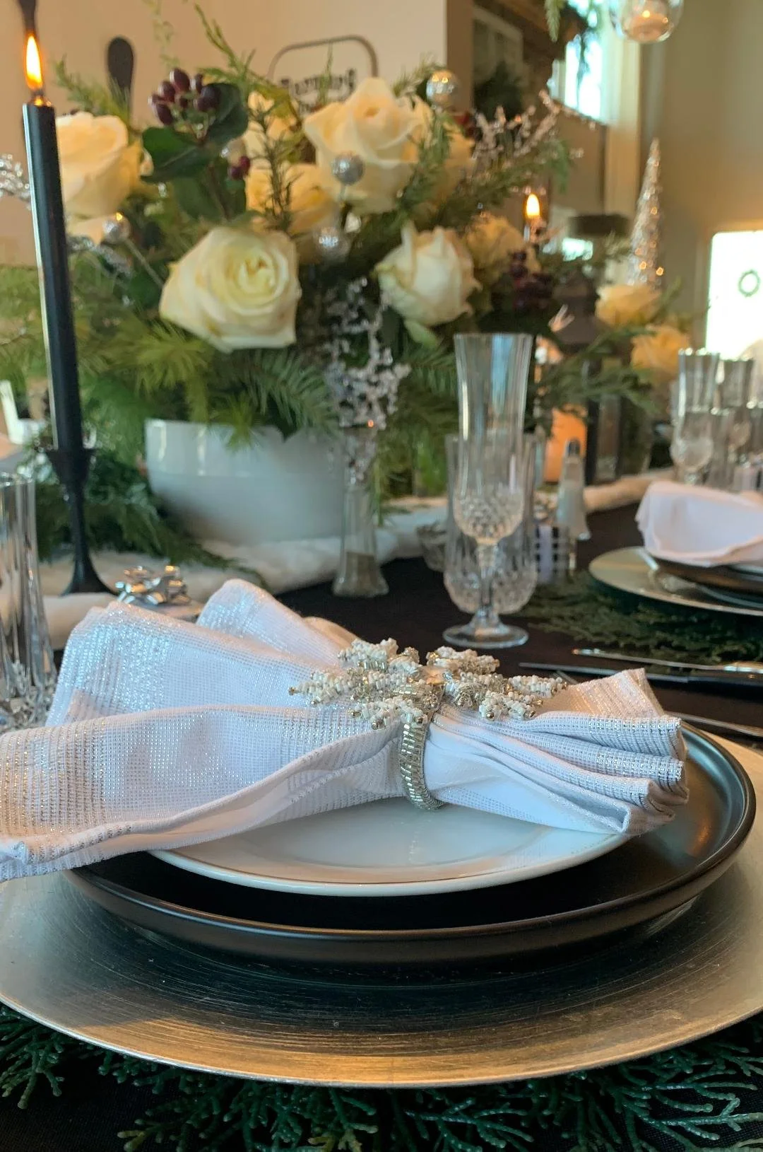 A custom hand-made rustic wood table or a 6ft plastic table, linen table cloth, glassware, chairs to match your chosen décor, ceramic plates, chargers, linen napkins, gold or silver flatware, candle holders and candles, small styling accessories, table runner, faux floral arrangements (fresh for an added cost).